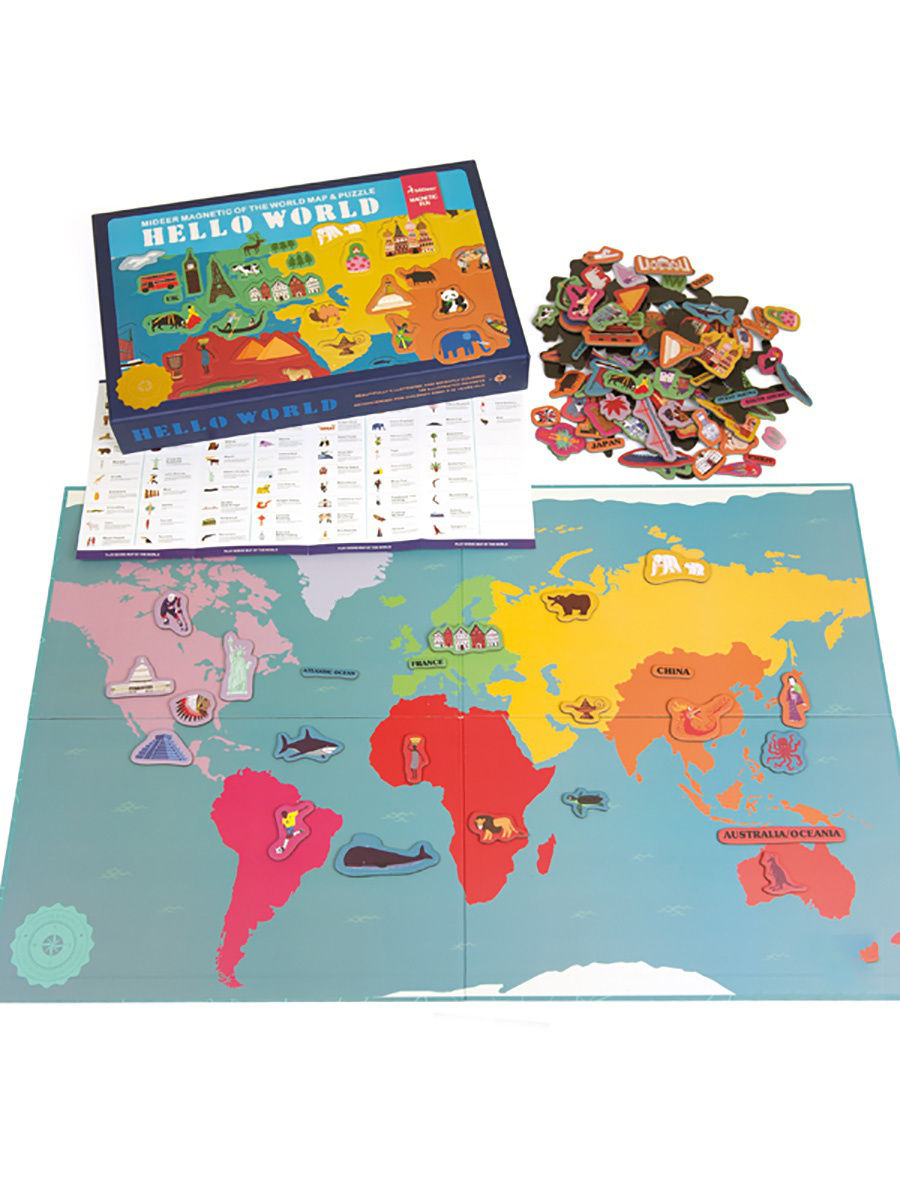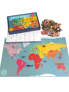 Магнитный пазл “Привет мир” состоит из большой карты-основы с нанесенными материками, океанами и морями и набора магнитов-пазлов 148 шт. с изображением достопримечательностей и памятников архитектуры, особенностей отдельных стран, растений, животных и птиц, обитающих на континентах. Магниты изготовлены из плотного ламинированного картона. Игра отлично подойдет для первого знакомства ребенка с этим удивительным миром, она развивает память, познавательные способности, воображение, внимание, логичеcкое мышление. Играть с картой будет интересно и вам и вашему ребенку, замечательный повод повторить забытое и узнать новое. На магнитах вы сможете найти достопримечательности и памятники культуры, архитектурные сооружения, национальные костюмы, животных и птиц, обитателей морей и океанов, и многое другое. Если вы не сможете объяснить ребенку к примеру изображенный на магните памятник архитектуры, то вам в помощь есть красочная инструкция, с интереснейшими фактами, которую вы найдете в коробке.