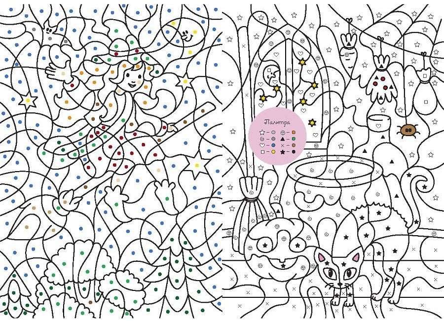 Более 30 волшебных сюжетов для раскрашивания по цветам, символам и номерам.