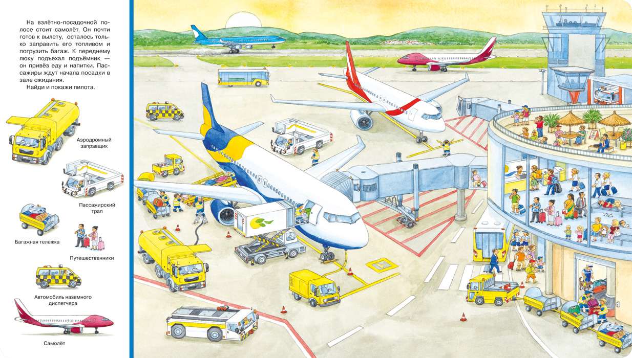 На каждом книжном развороте внимание Вашего малыша привлекут красочные сюжетные изображения множества различных ситуаций, связанных с полётом на самолёте. Они расскажут об устройстве аэропорта, аэровокзала и самого воздушного лайнера, о разных видах авиационных профессий, о правилах поведения во время полёта и, конечно же, о самом путешествии.