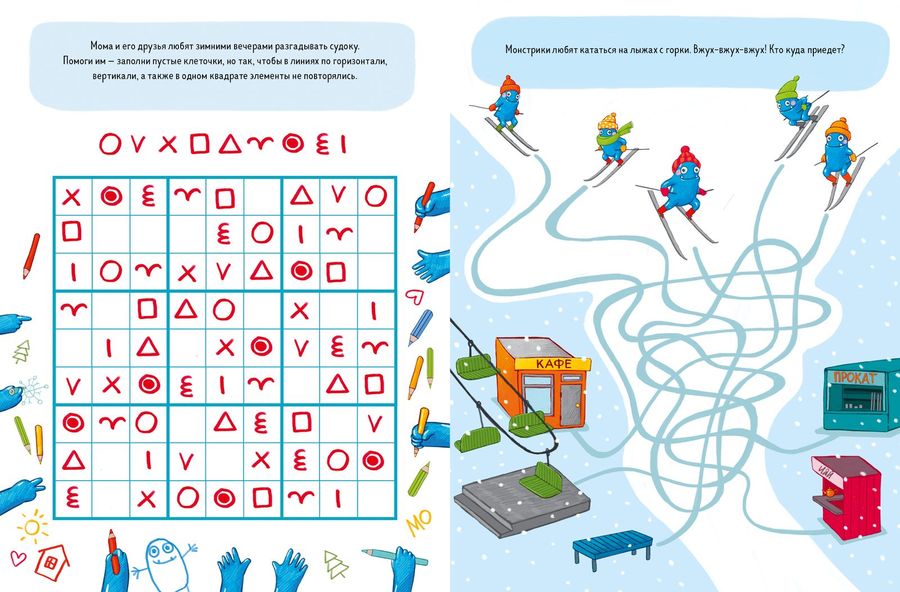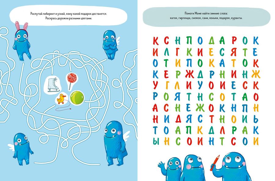 Книга «Монстрики встречают Новый год» познакомит ребенка с милейшими монстриками, в компании которых зимние праздники пролетят незаметно. Монстрик Мома, как и ваш малыш, очень любит зиму и просто обожает разгадывать ребусы, решать задачки и головоломки, раскрашивать, искать отличия и сходства, играть в «найди и покажи». Вместе вы покатаетесь на лыжах, коньках, санках, выпьете вкусное какао с зефирками и слепите снеговика.