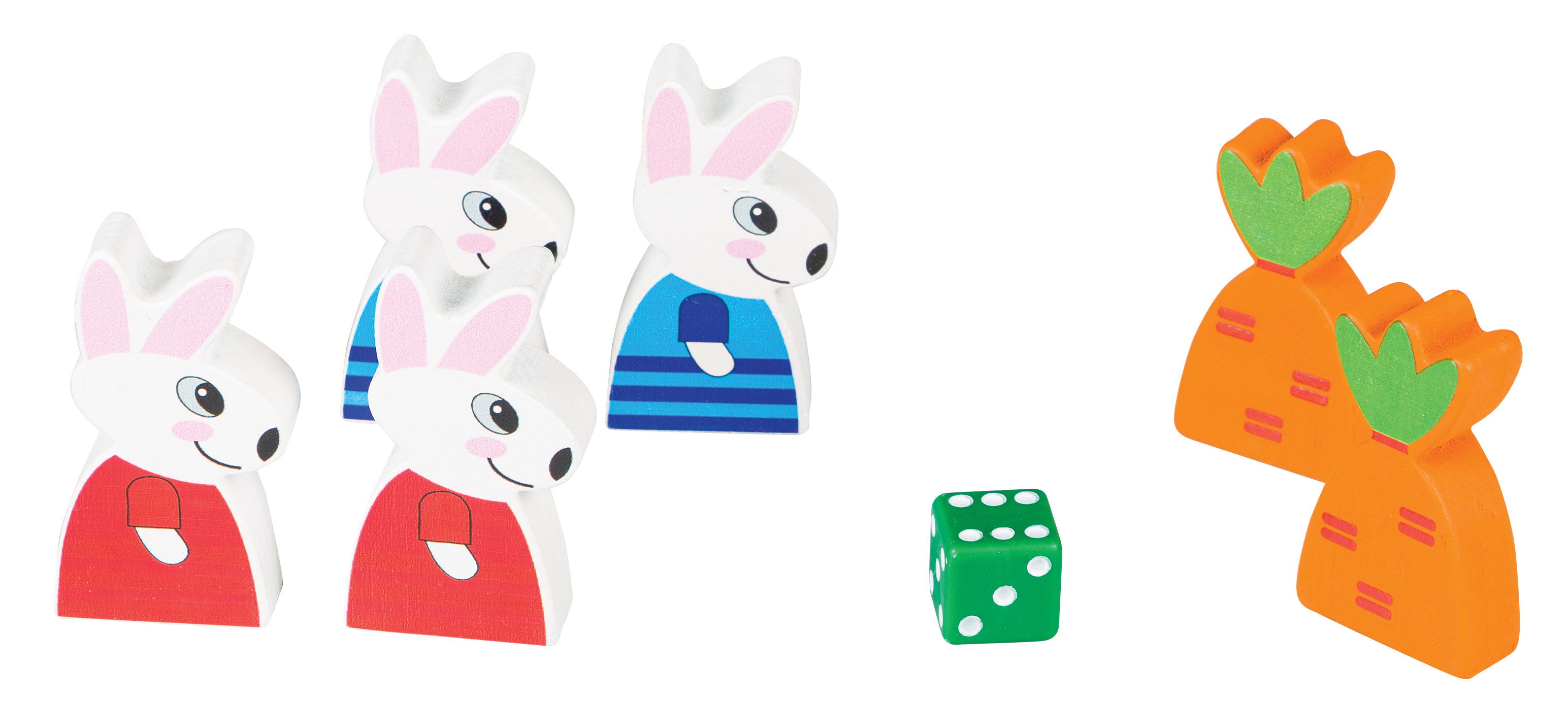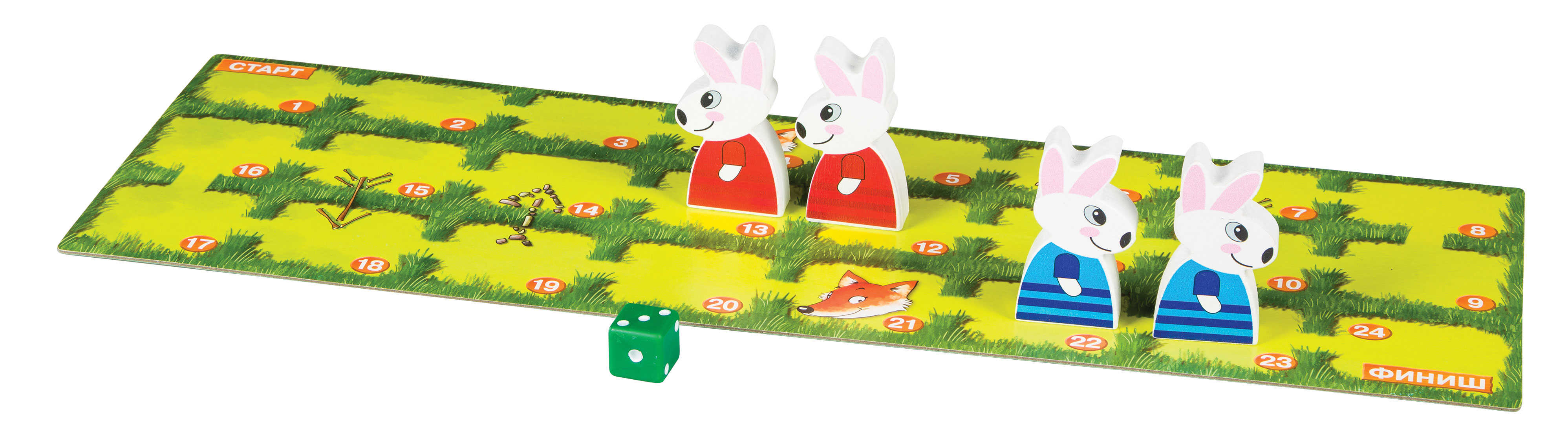 Выигрывает игрок, кролик которого первым доставит морковь на старт второму кролику.