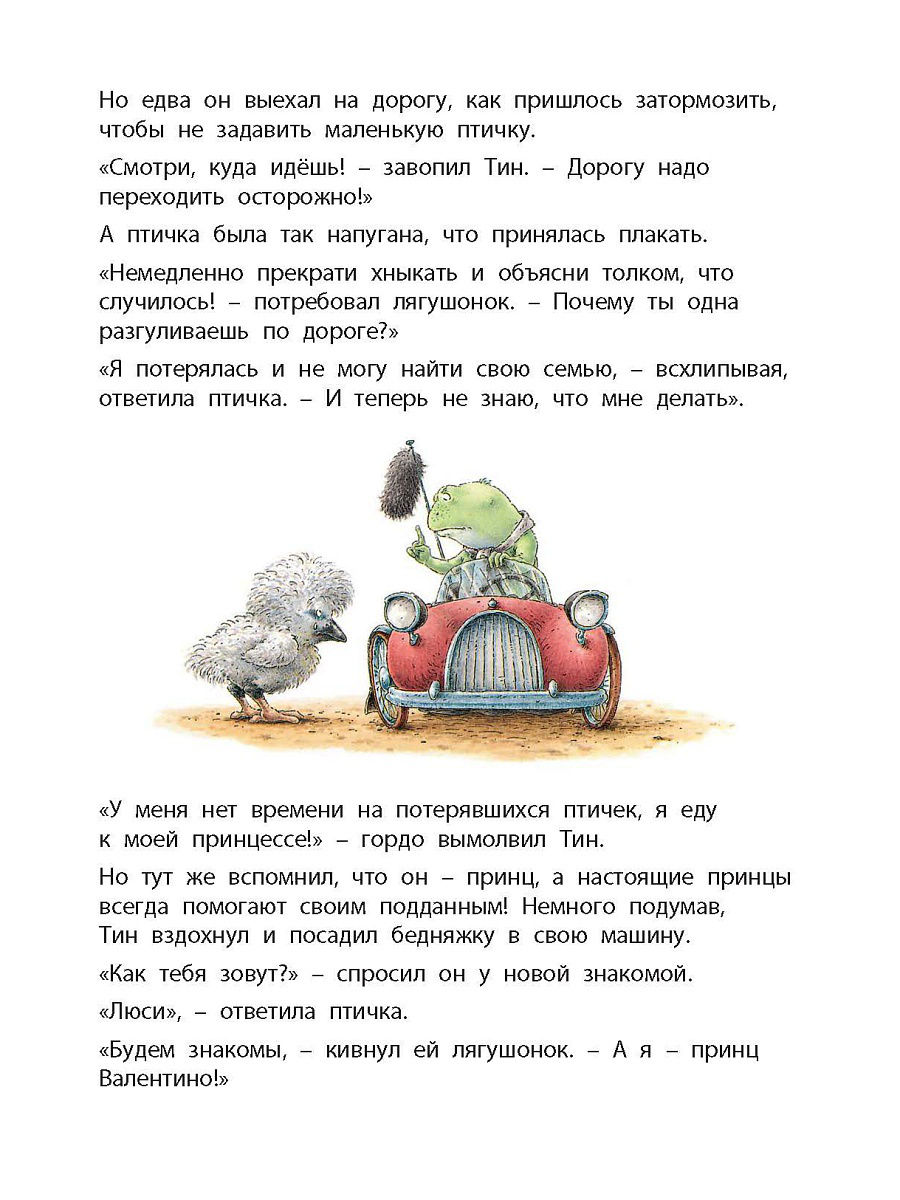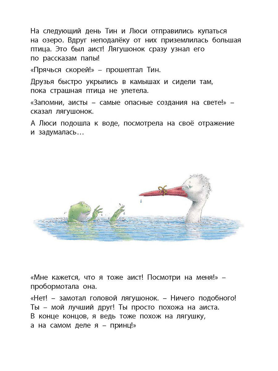 Мама-лягушка очень любила своего единственного сыночка и ласково называла его "мой маленький принц". Лягушонок Тин так привык слышать эти слова, что возомнил себя настоящим принцем, которого высоко в горах ждёт прекрасная принцесса. Чтобы доказать всем, что он особенный, Тин отправился в горы на поиск своей мечты, однако встретился с ней совсем в другом месте. Трогательную и поучительную сказку о дружбе лягушонка и аистёнка создали два талантливых голландца: детский писатель, продюсер и сценарист Берни Бос и известный художник Ханс де Беер. Для чтения взрослыми детям.