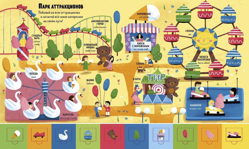 Яркие красочные картинки и крупный шрифт позволит детям легко усвоить информацию на русском и английском языках.