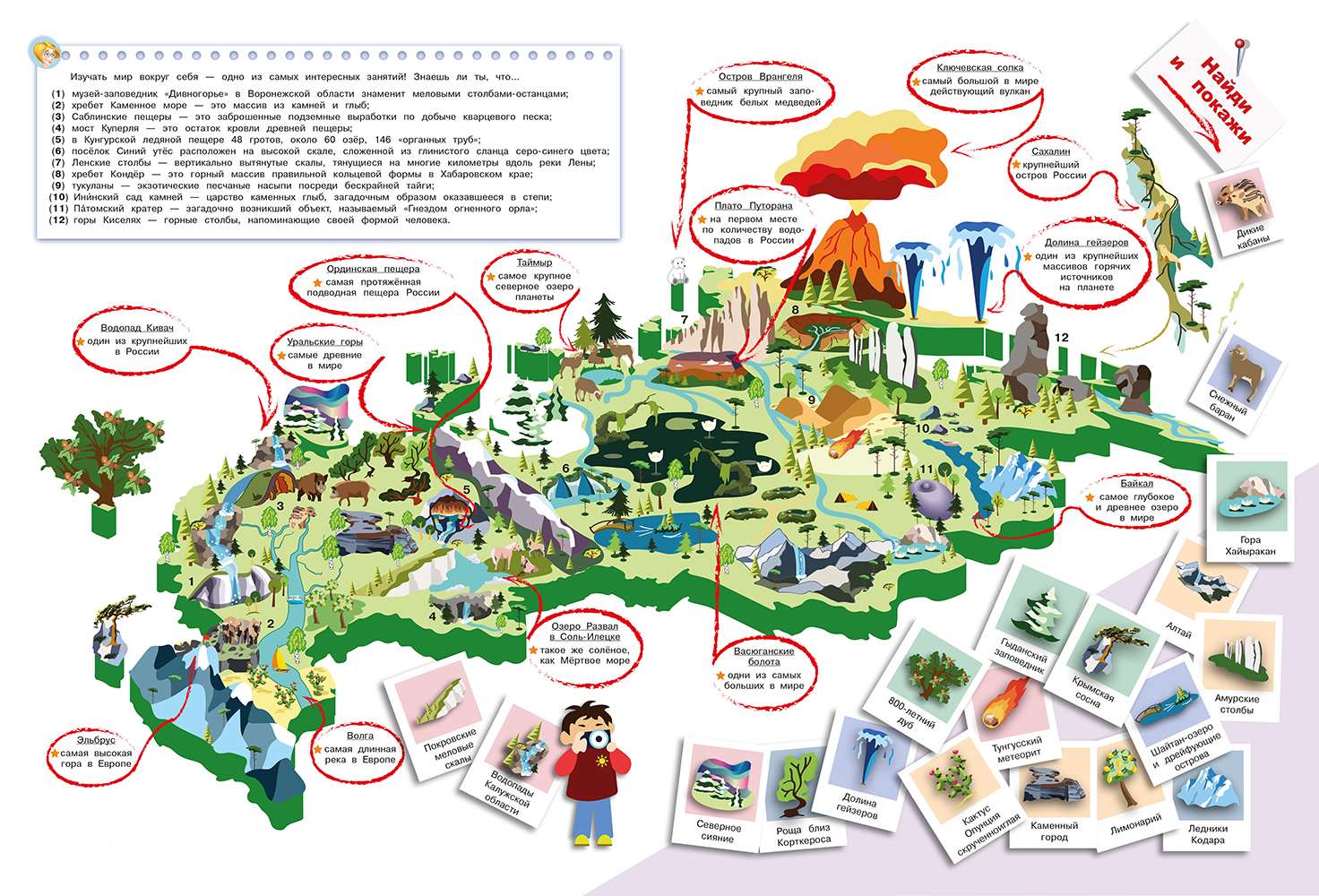Открой атлас и соверши путешествие по самой большой стране мира. Этот атлас поможет вашему ребенку запомнить крупные города России, названия морей, крупных рек, высоких гор.
