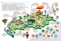 Все надписи даны крупным шрифтом. В середине книги расположен лист с наклейками. Изображения наклеиваются на специально отмеченные места в атласе.