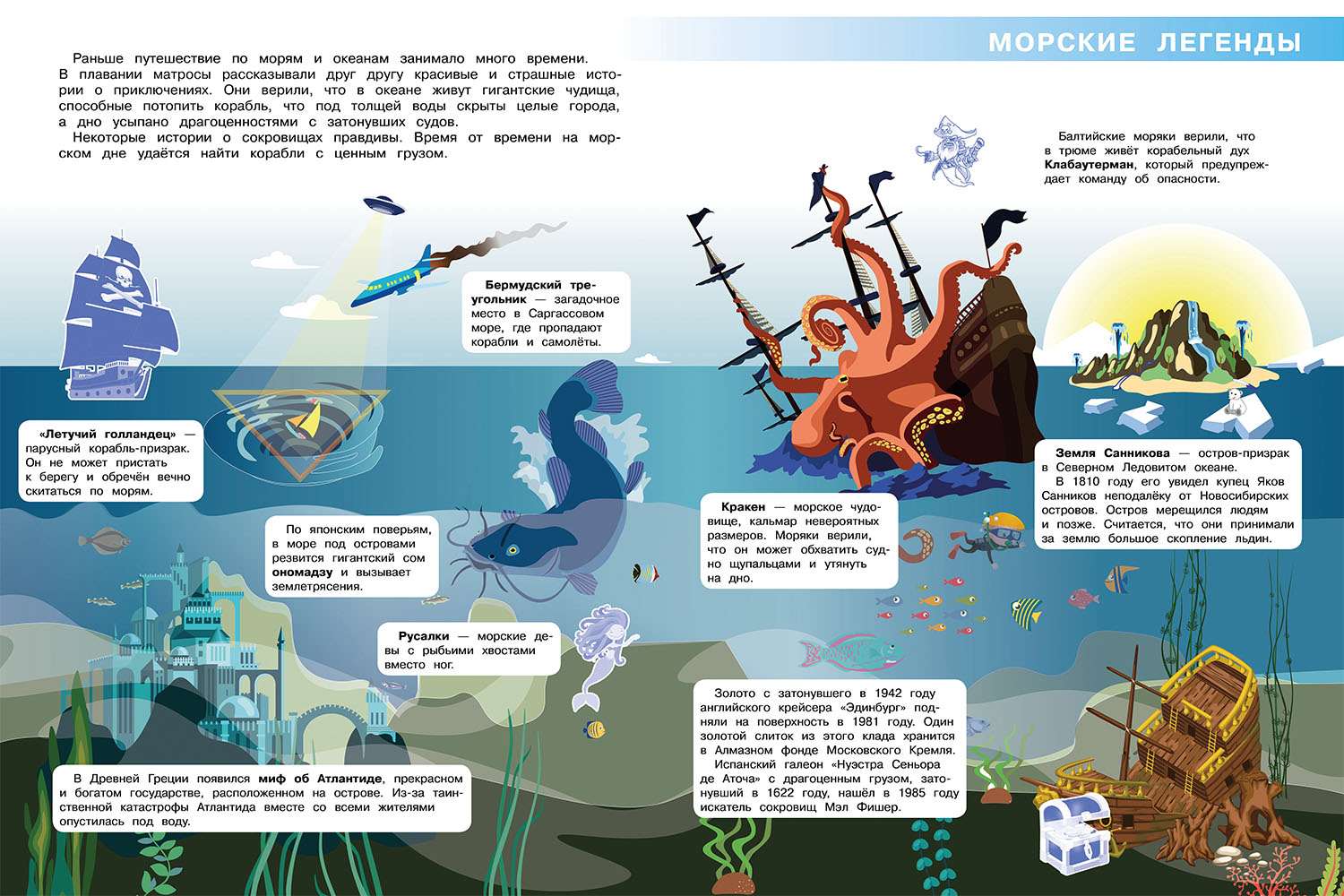 Атлас можно использовать в качестве оригинального учебного пособия для детей младшего школьного возраста, которое в игровой и занимательной форме расскажет Вашему ребёнку много интересного об океанском дне и богатствах, которые оно скрывает, познакомит его с морскими обитателями и удивительными морскими легендами.