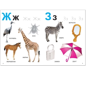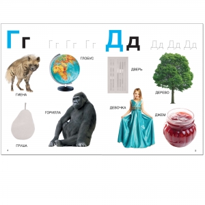 На каждую букву отведена отдельная страница с красочными фотографиями и подписями к ним. При этом одной картинки не хватает, ребенку предстоит найти ее среди наклеек и приклеить на нужное место.