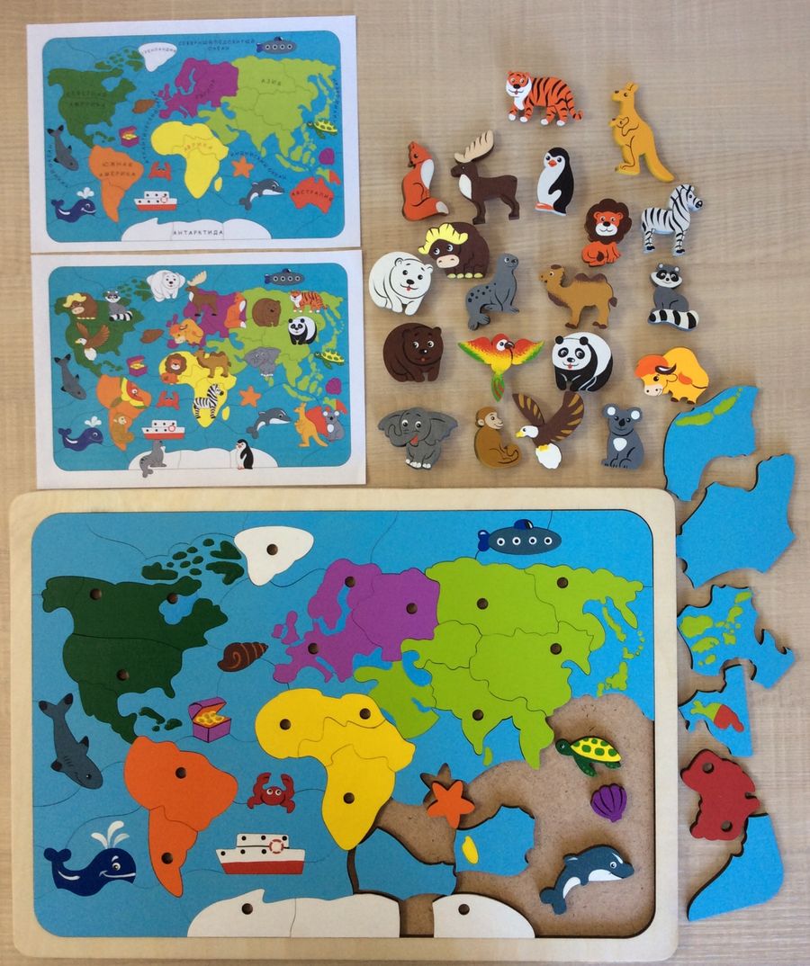 Карта мира - это двухуровневая красочная мозаика для детей дошкольного возраста. Большое поле (формат двух альбомных листов) собирается из 62 элементов. Мозаика дополнена 20 фигурками. В помощь ребенку и родителям в комплект вложены 2 цветных вкладыша. На одном указаны названия материков и океанов, на втором - места обитания животных, млекопитающих и птиц.