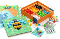 В комплекте: деревянная основа, карточки с заданиями (8 шт), пластиковые детали мозаики (120 шт).