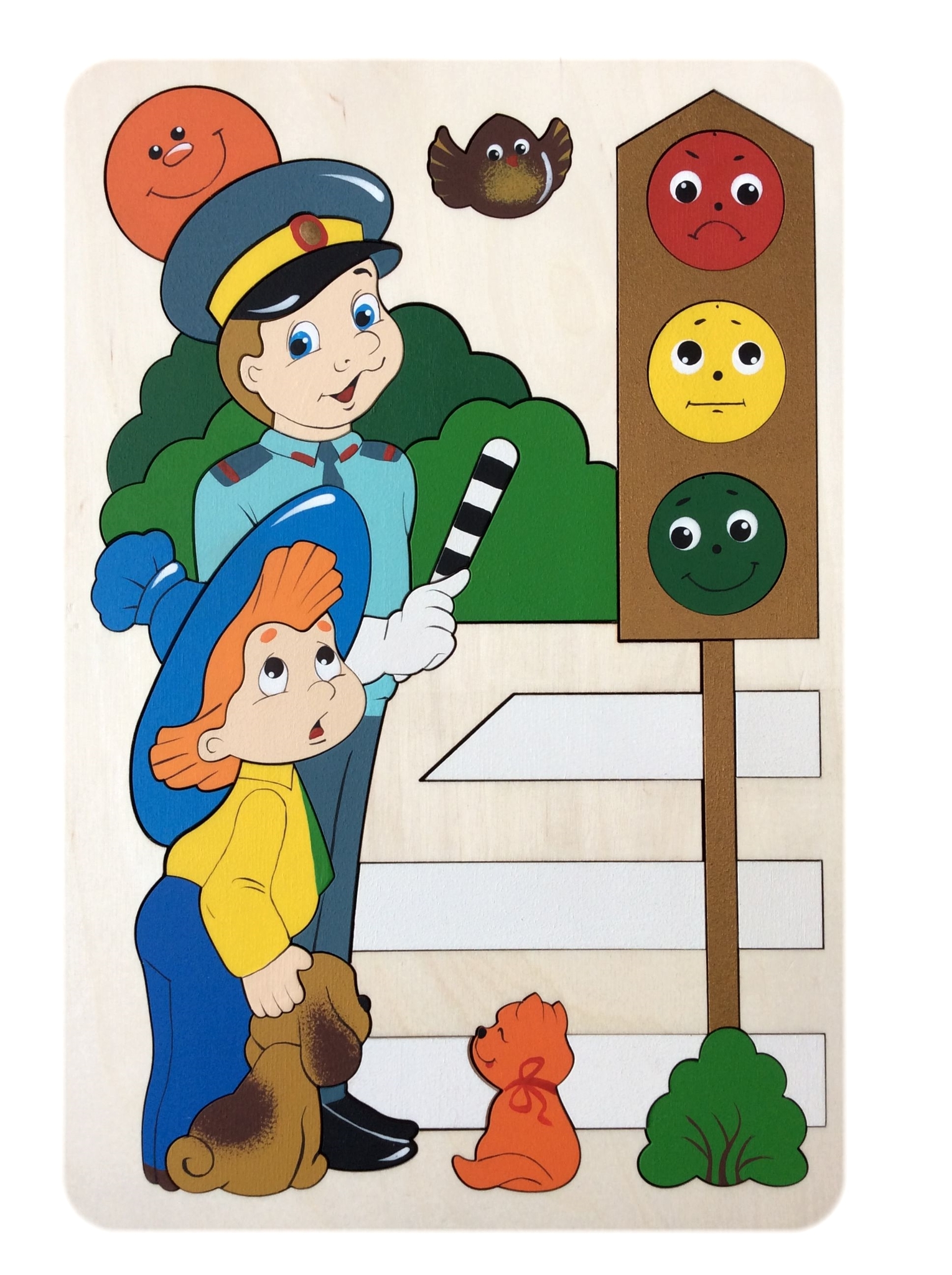 Перед вами сюжетная мозаика ручной работы. Незнайка приехал в большой город. Он совсем не знает, как и где нужно переходить проезжую часть. На помощь ему пришел полицейский, который рассказал гостю города и его четвероногим друзьям правила дорожного движения для пешеходов.