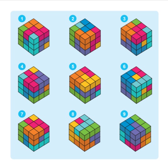 Ребенку необходимо понять, каким образом расположить остальные детали, чтобы собрать кубик. Решения, по которым ребенок сможет проверить себя, входят в комплект. Игра-головоломка Кубиссимо замечательно подходит для детей раннего школьного возраста, с её помощью у детей возникнет понимание форм, объёмов различных сложных фигур.