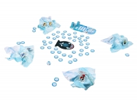 В состав настольной игры Озорные пингвины входят: 4 бумажных айсберга, 2 деревянные фигурки родителей-пингвинов, 8 жетонов с пингвинятами, 1 планшет, 48 жетонов с льдинками, 1 кит, 1 резинка, 1 кубик, правила игры.