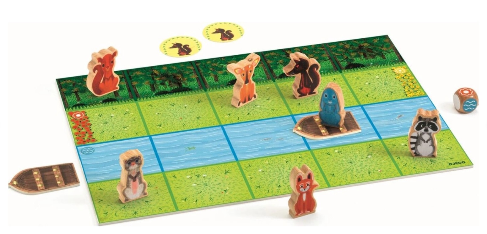 Клетка указывает на движение, которое нужно сделать, а защитные карты помогут детям противостоять волку. Как только все 6 животных достигли леса на другом берегу реки, они в целости и сохранности!