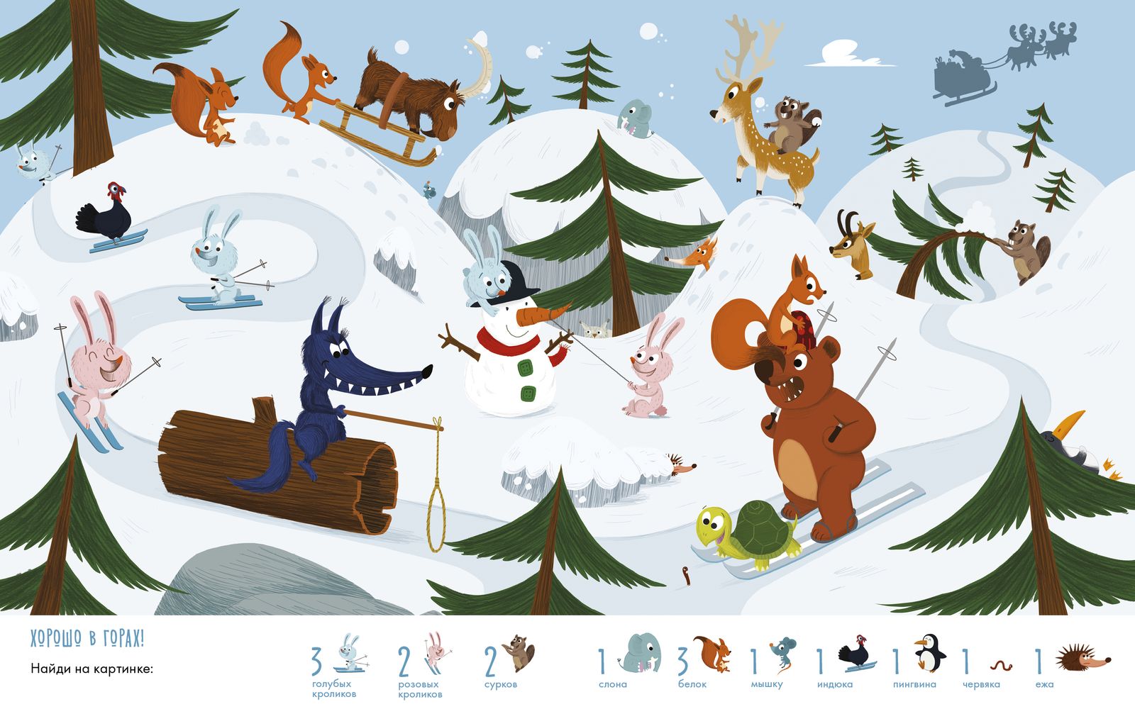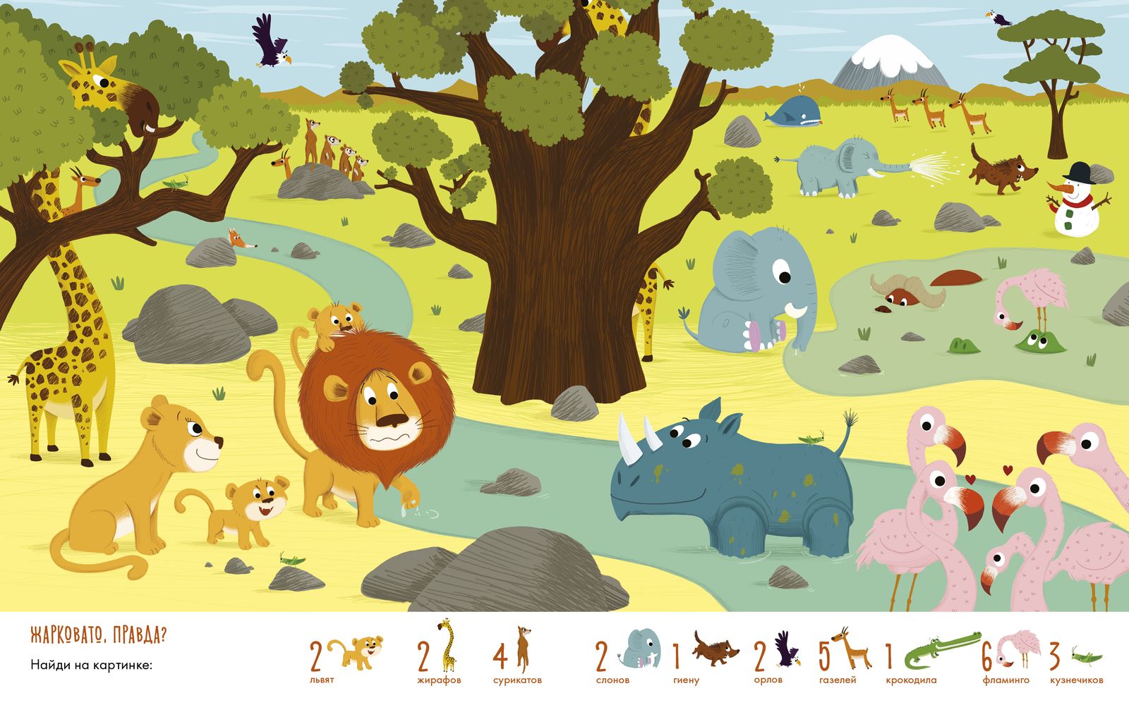 В лесу, в саванне, на полюсах, в горах, в деревне, в джунглях, в океане и даже в городе живёт много интересных и очень забавных животных! Рассматривайте их, считайте, ищите на рисунках ответы на несложные вопросы и задания, придумывайте истории на основе красочных картинок, а также играйте в веселую игру «Найди и покажи».