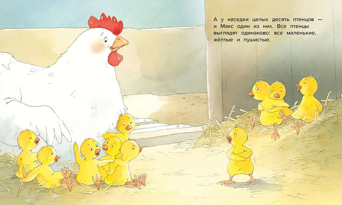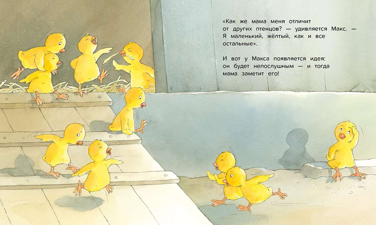 Макс — один из десяти птенцов, которые появились у мамы-наседки. Все они одинаковые: маленькие, жёлтые и пушистые. Максу становится интересно — как же мама отличит его от остальных птенцов? Может быть, если он будет плохо себя вести, это привлечёт её внимание? И Макс начинает свой праздник непослушания. Получится ли у него? И как поступит мама?