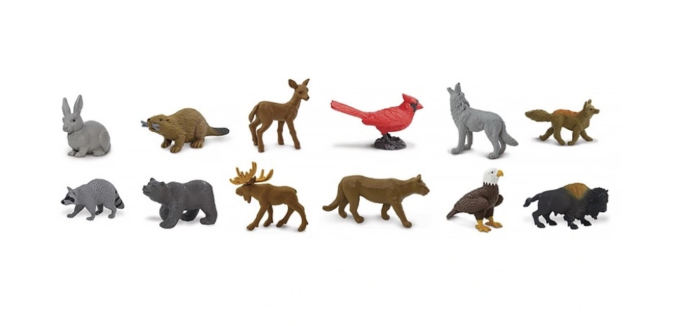 Набор включает 12 фигурок обитателей леса: кролик, бобёр, лань, красный кардинал, волк, лиса, енот, черный медведь, лось, пума, белоголовый орлан и бизон. Размер фигурок варьируется от 4 до 7,5 см. Возраст: 3+