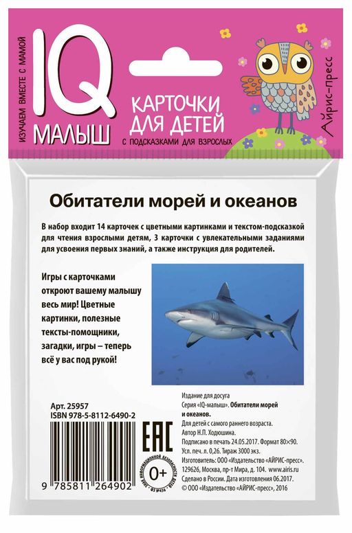 Набор двусторонних карточек познакомит ребёнка с морскими животными. В комплект входит 14 карточек с цветными изображениями морских обитателей и текстом-подсказкой на обороте для чтения взрослыми детям, 3 карточки с заданиями для детей, а также карточка с инструкцией для родителей. Игры с карточками развивают память, зрительное и слуховое восприятие, расширяют словарный запас, формируют интеллект.