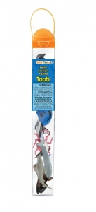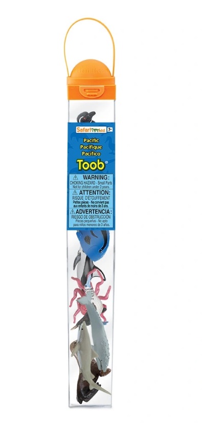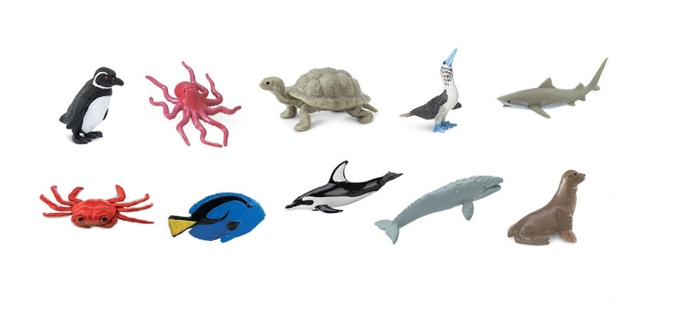 Набор из 10 фигурок животных, обитающих в зоне Тихого океана: галапагосский пингвин, осьминог, сухопутная черепаха, птица голубоногая олуша, тигровая акула, краб, рыба-хирург, короткоголовый дельфин, серый кит, морской лев. Размер фигурок варьируется от 2 до 9 см.Фигурки окрашены вручную.