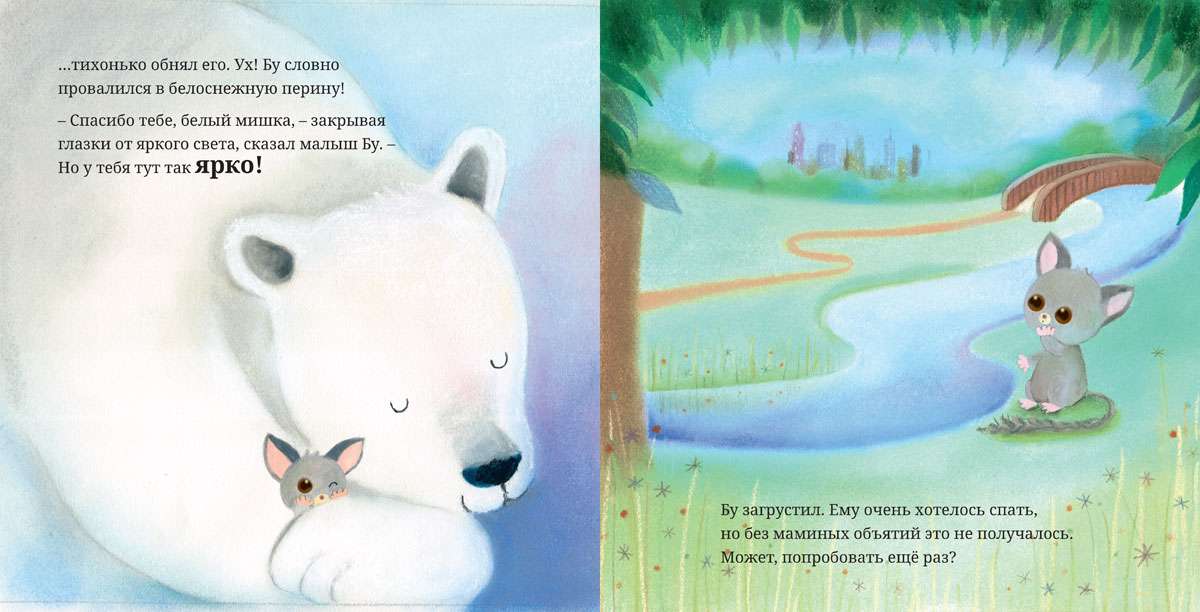Наступило утро. Все звери в зоопарке либо проснулись, либо пробуждаются, и только Крошка Бу, детёныш маленького африканского зверька галаго, собирается... ложиться спать. Ведь он ночной зверёк - значит, спит днём, а бодрствует ночью. Перед сном мама всегда обнимает его, но сегодня мамы рядом не оказалось, и Крошка Бу решил отправиться на поиски того, кто сможет обнять его и приласкать. Кто это будет? Может быть, кенгуру? Или крокодил?! Кто знает...