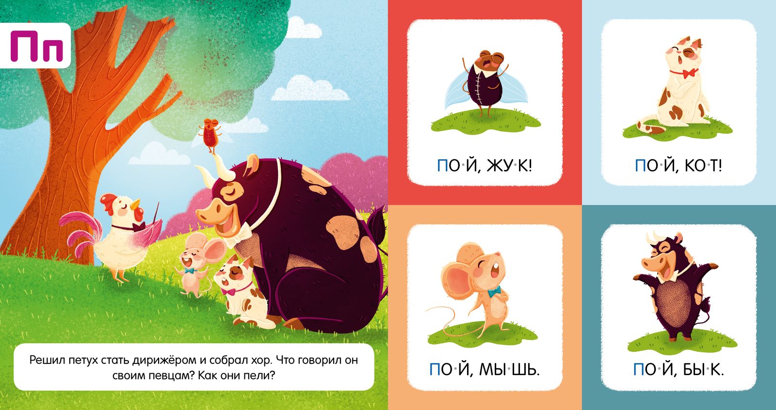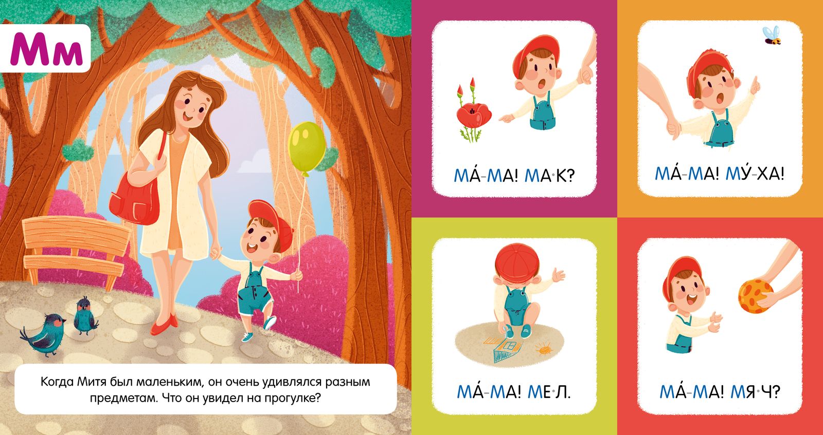 Перед изучением буквы взрослому предлагается прочесть сказку (этот текст расположен возле сюжетной иллюстрации слева на каждой странице), а справа расположены 4 яркие картинки со словами, которые ребенок легко прочтет сам.