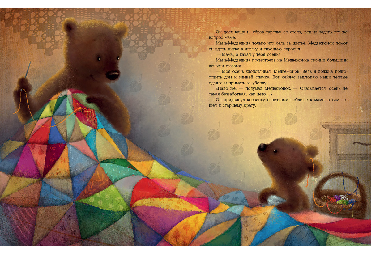 Маленький Медвежонок родился зимой и видел свой первый снег, а весной наблюдал, как набухают почки и ждал яркого летнего солнышка? А что же такое осень, о которой все так говорят? У бабушки-Медведицы осень медовая и сладкая, у мамы - хлопотливая, у старшего брата - увлекательная, а у папы-Медведя - красочная и вкусная, как грибной суп. Какая же осень у маленького Медвежонка?