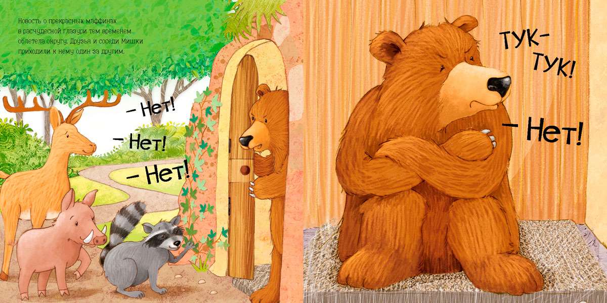 Однажды папа Мишка решил порадовать своего сына сахарными маффинами. Он встал пораньше, напёк маффинов и украсил их восхитительной сахарной глазурью. М-м! На аромат вкуснейших кексов стали приходить соседи: "Не дашь ли ты, Мишка, мне один такой маффин?" -- спрашивали они. "Нет!" --отвечал суровый медведь. Усталый, он прилёг отдохнуть, а когда проснулся... конечно же, чудные маффины исчезли! Что же случилось, что теперь делать?