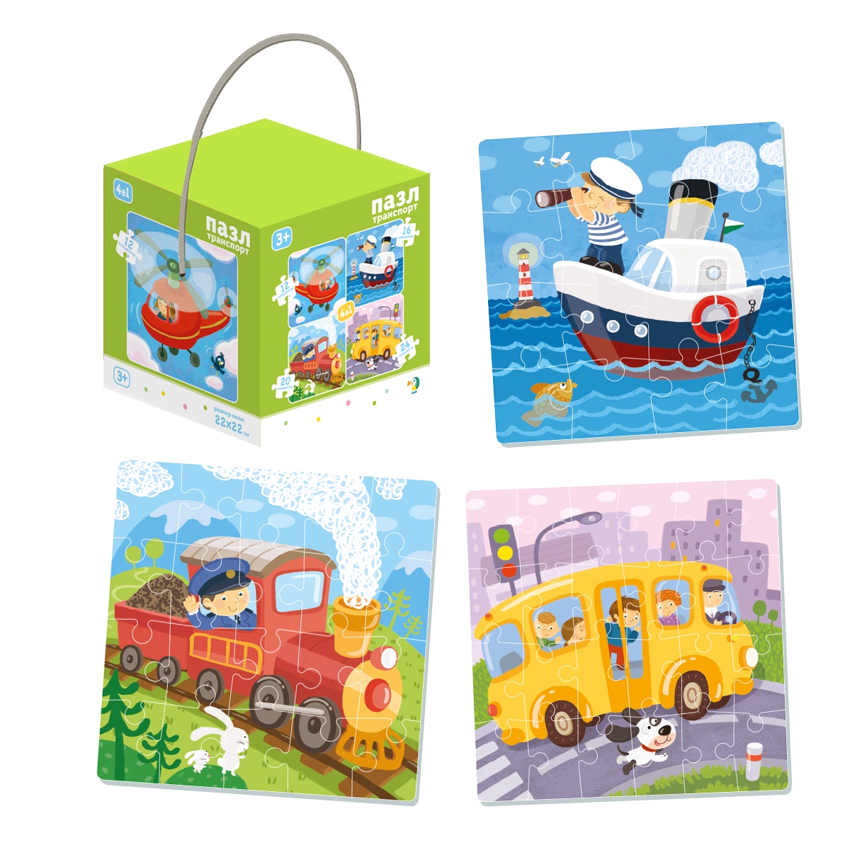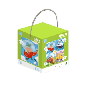 Замечательный набор от компании «Dodo» представлен 72 катонными деталями, из которых ребенок с увлечением будет собирать красочные картинки с изображением разного вида транспорта. Причем задача будет усложняться, ведь пазлы собираются из разного количества фрагментов.