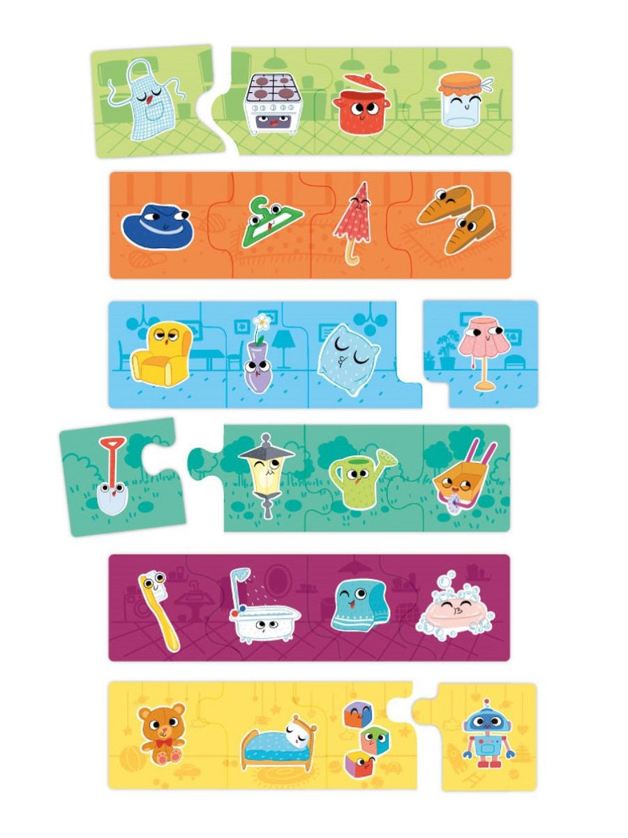 Играем в ассоциации с самыми маленькими, даже с тем, кто ещё не умеет говорить. Игра включает в себя 24 элемента, которые складываются в 6 ассоциативных рядов из предметов, которые есть в каждом доме. Малышу будет интересно и весело собирать красочные картинки в линии. В процессе игры ребёнок тренирует память, развивает мышление и выстраивает взаимосвязи между предметами. Крупные элементы пазла выполнены плавными изгибами и легко соединяются между собой.