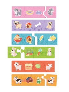 Играем в ассоциации с самыми маленькими, даже с тем, кто ещё не умеет говорить. Игра включает в себя 24 элемента, которые складываются в 6 ассоциативных рядов из предметов и зверят, которых знает каждый малыш. В процессе игры ребёнок тренирует память, развивает мышление и выстраивает взаимосвязи между предметами и зверятами. Крупные элементы пазла выполнены плавными изгибами и легко соединяются между собой. Каждая линия оформлена в одной цветовой гамме.