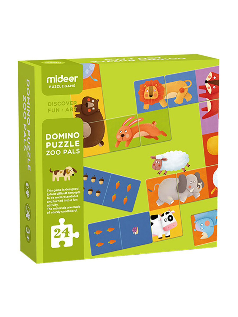 Пазл-домино "Животные" от компании MiDeer состоит из 24 двусторонних ярких карточек, с одной стороны карточки выглядят как всем нам привычное домино с разным количеством насекомых, мухоморов, желудей и т.д., а с другой стороны изображены забавные картинки животных. Игра начинается с того, что каждому игроку раздается по 6 карточек. Далее игроки последовательно должны выложить карточки со второй частью изображения животных или точек. Забавные изображения животных - слона, коровы, зайца, льва, и многих других - порадуют малыша и сделают игру интереснее. Игра прекрасно развивает смекалку ребенка, внимательность и моторику. Учит его усидчивости, счету, логическому мышлению.