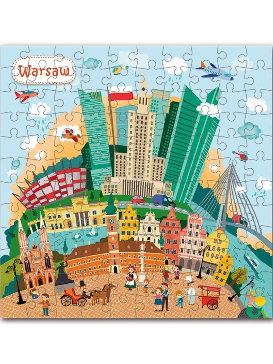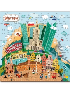 Пазл с изображением столицы Польши, на котором изображены главные достопримечательности города. Состоит из 120 элементов, размер собранного пазла 32 на 32 см. Пазл развивает внимательность, логику и мелкую моторику ребенка.