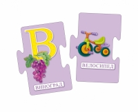 - 35 двусторонних карточек-пазлов с изображением буквы, предмета на эту букву и его названия.Карточки можно соединять между собой (каждой карточке с буквой соответствует картинка с изображением предмета, название которого начинается на эту букву). Малышу нужно найти и соединить буквы и картинки, чтобы он не запутался, пары выделены одним цветом.