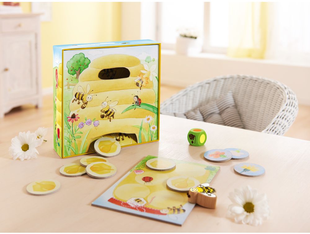 Для игры установите улей вертикально, а цветы разложите возле баночки с медом. Бросив кубик, малыш помогает пчелке найти цветок такого же цвета и отнести его в улей. Веселый механизм улья, при котором брошенный внутрь цветок выпадает снизу капелькой меда, приводит детей в восторг :)