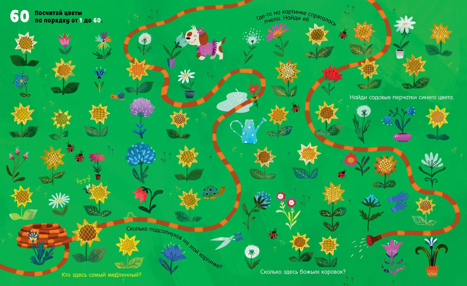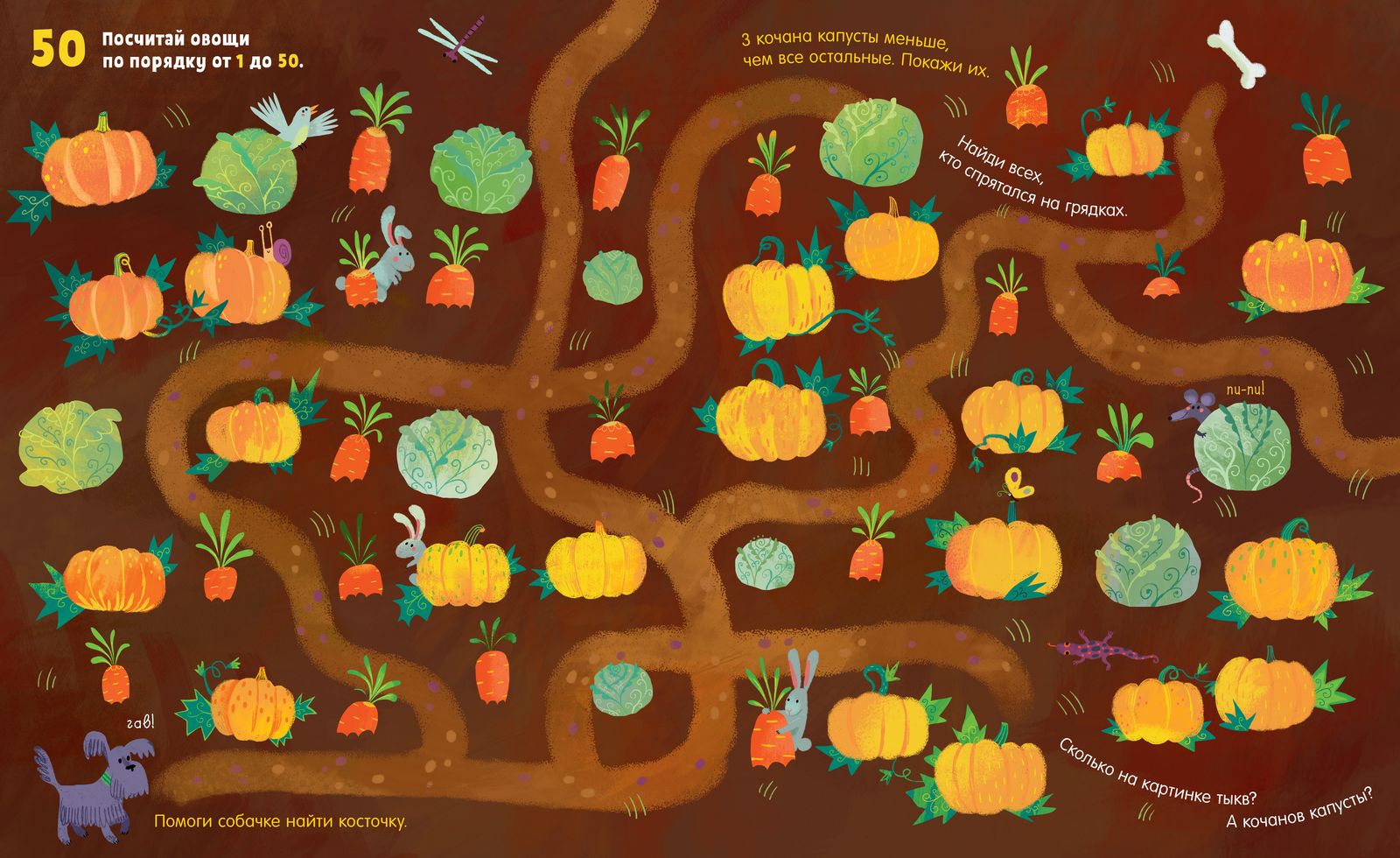На страницах вы даже сможете играть в «Найди и покажи», ведь на каждом развороте десятки интересных деталей! Каждая страничка книги наполнена потрясающими иллюстрациями — ни один ребенок не заскучает! Считайте овощи, цветы, животных, снежинки — каждый разворот совершенно не похож на предыдущий! Кроме счета вы можете предложить малышу другие необычные задания, они сделают обучение еще веселее: найдите самого нарядного козлика, помогите собаке отыскать свою косточку или узнайте, кто спрятался на грядках.