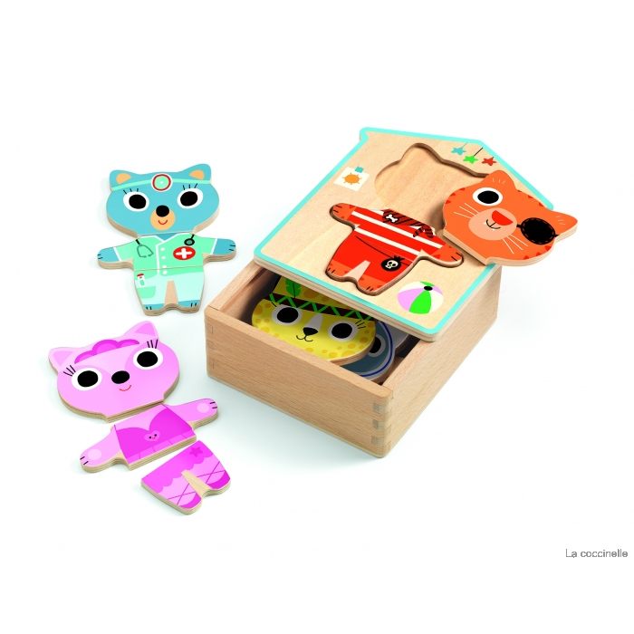 Игра представлена в виде деревянной коробочки, в которой хранятся детали пазла, крышка выполнена в виде домика с выемкой. Ребенку необходимо собрать из трех деревянных деталей забавных котиков в разной одежде: кошечка-балерина, котик-доктор, котик-пират, котик-индеец. Малыш сможет узнать, как выглядят разные костюмы.