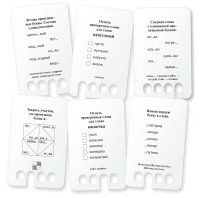Первая игра с карточками построена по типу теста. Нужно найти пропущенную букву, убрать лишнюю букву, исправить ошибку, подобрать слово к правилу русского языка и т. п. После выбора ответа нужно вставить карандаш в отверстие под ним. Если ответ правильный, то карточка легко вынимается из блока. Если ребёнок выбрал неверный вариант ответа, он не сможет вытянуть карточку и перейти к следующему заданию.