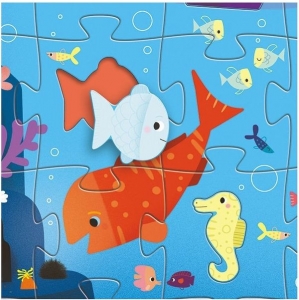 Персонажи пазла - это забавные рыбки и обитатели морских глубин, выполненные в виде отдельных больших деталей. Собирая пазл Djeco, ребёнок постепенно постигает принцип сложения целого из кусочков, делая очередное маленькое открытие. Подбирая необходимые пазлы по цветам и изображенным деталям, дети учатся мыслить логически, развивается память и внимание.
