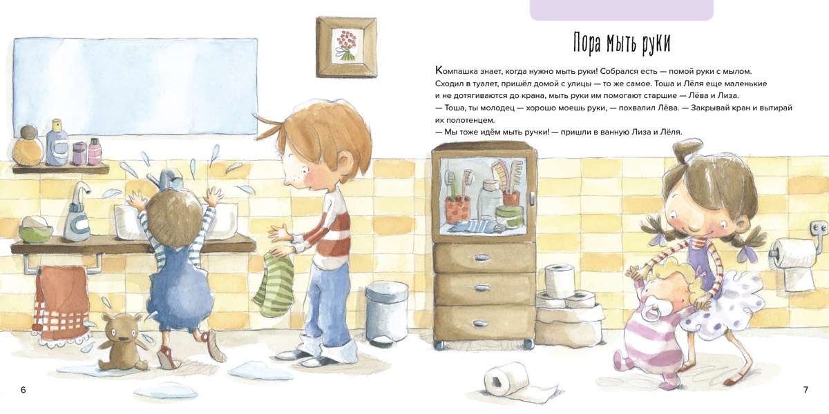 Компашка знает: чтобы быть весёлым и здоровым надо… нет, не только заниматься спортом — в первую очередь надо быть чистым! Лёва и Лиза уже большие и умеют мыть руки, чистить зубы, расчёсываться, знают, когда нужно ложиться спать и куда складывать грязную одежду, и они учат быть чистыми и аккуратными Тошу и Лёлю.