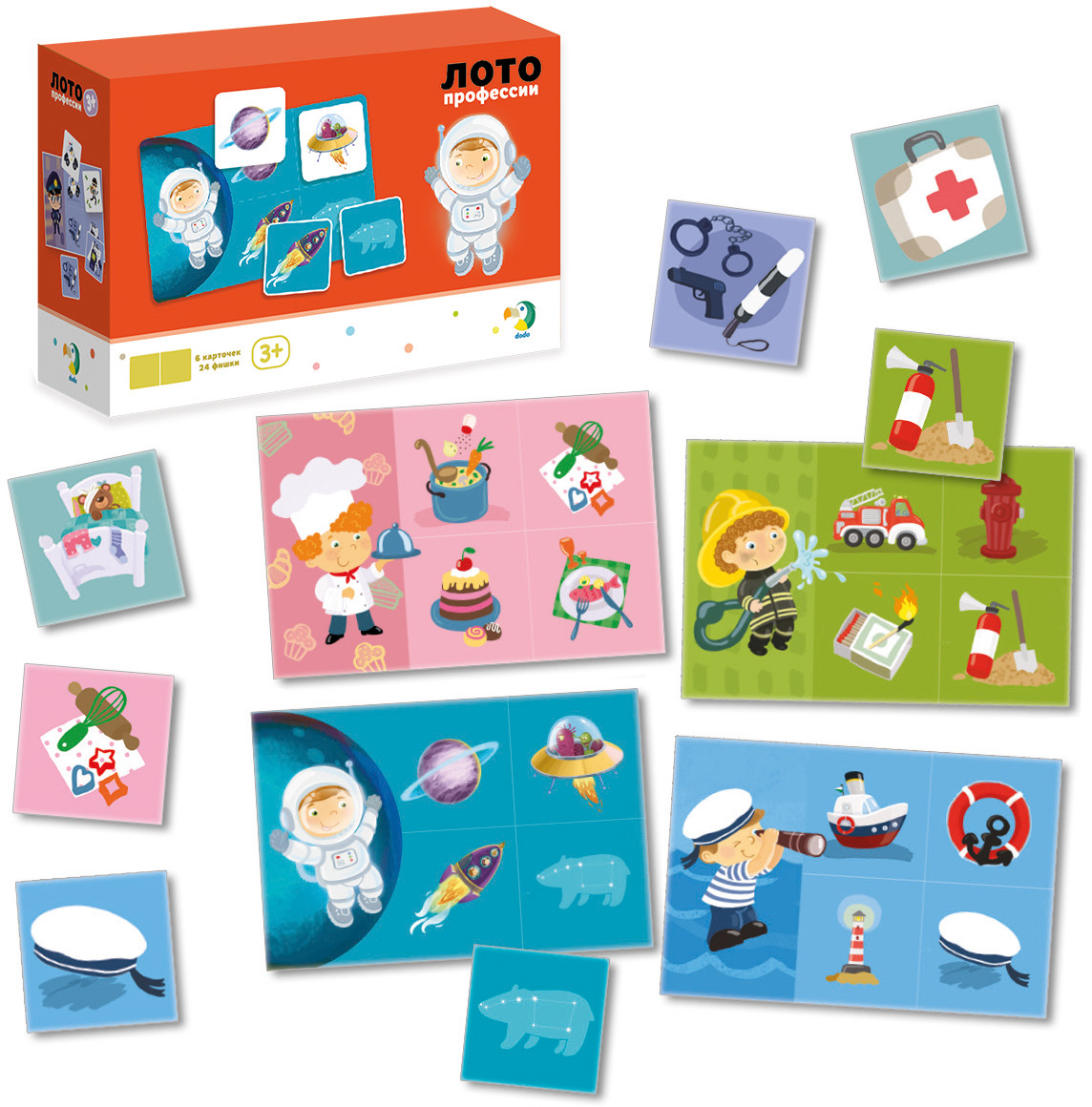 - Лото для малышей представлено красочно оформленными 6 игровыми карточками с изображением людей разных профессий и 24 прямоугольными фишками с их профессиональными атрибутами.