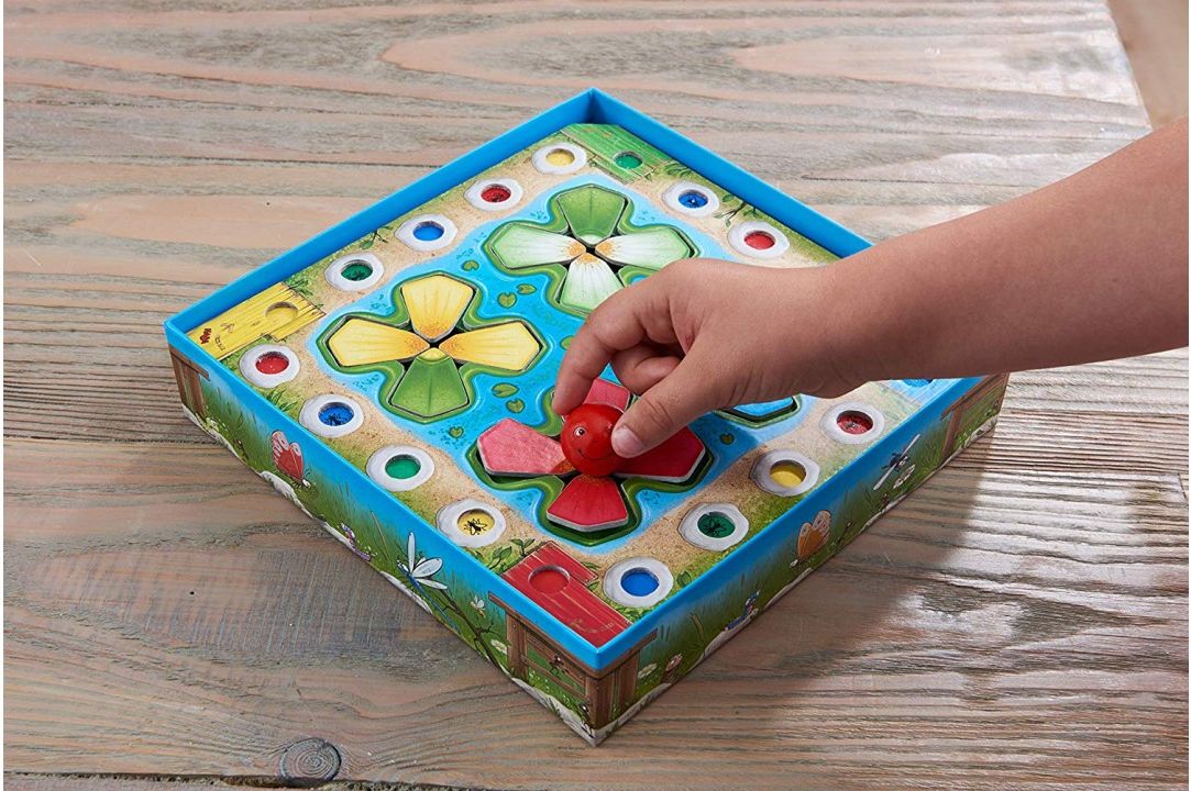 - Поместите основание коробки, представляющее пруд с кувшинками, в центре стола. Сортируйте лепестки по цвету и поместите их в вырезы лицевой стороной вниз. Выберите шарик-лягушку и поместите ее на стартовую клетку.