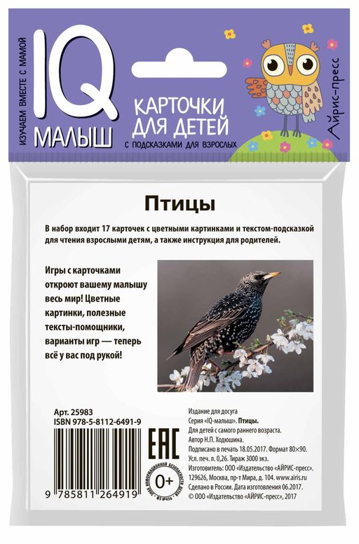 Игры с карточками не просто знакомят малыша с нашим удивительным миром, они развивают память, зрительное и слуховое восприятие, расширяют словарный запас, формируют интеллект. С помощью этого набора двусторонних карточек ребёнок познакомится с разными птицами. В комплект входит 17 карточек с цветными картинками и текстом-подсказкой на обороте для чтения взрослыми детям, а также карточка с инструкцией для родителей.