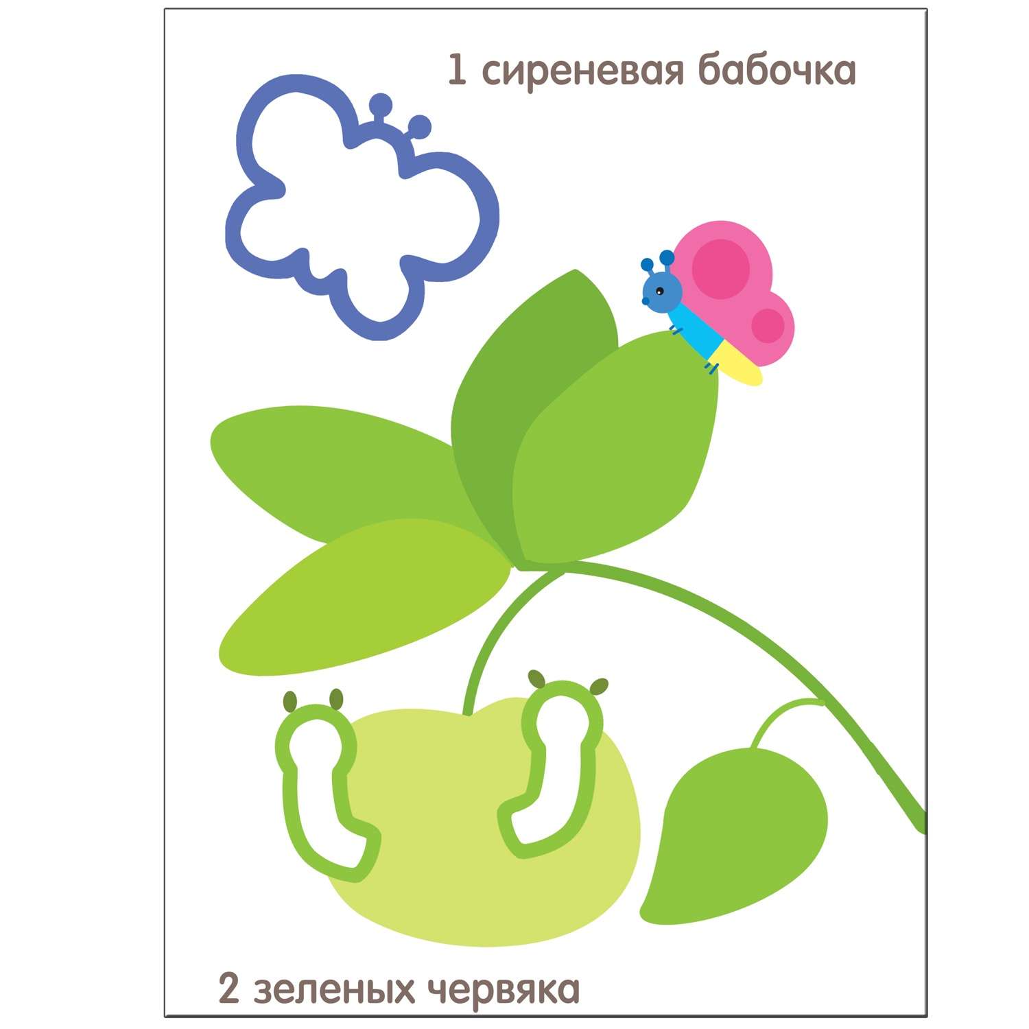 Так, на первой странице нарисована 1 сиреневая бабочка и 2 зеленых червячка.