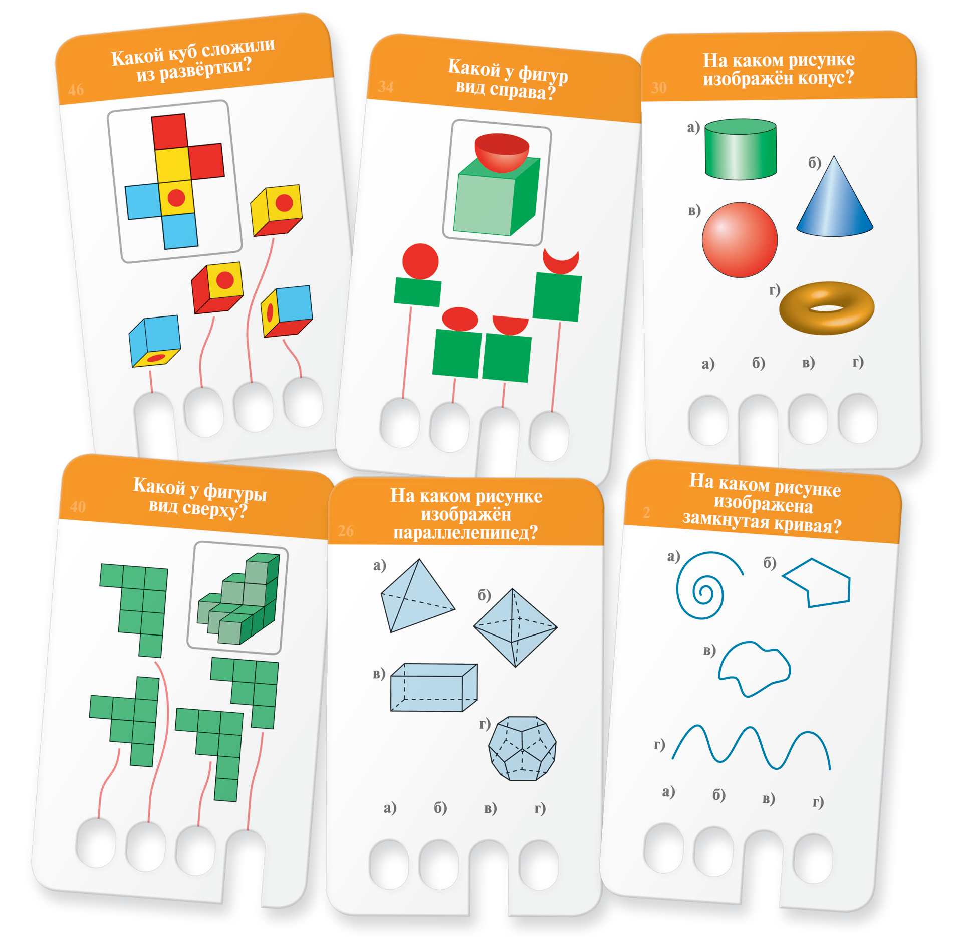 Во второй игре ребёнок будет отвечать на вопросы, рисовать, развивая пространственное мышление, закрашивать или дорисовывать грани фигур, определять оси симметрии и т. п. Ответ вписывается карандашом, затем можно вытянуть карточку из блока и проверить себя, сверяя свой ответ с правильным.