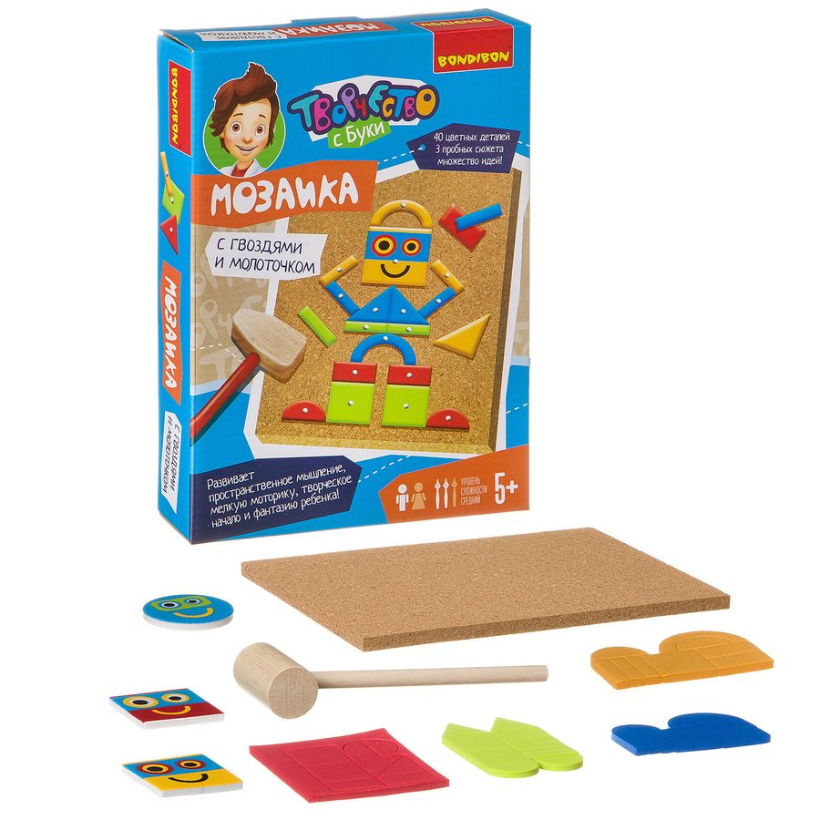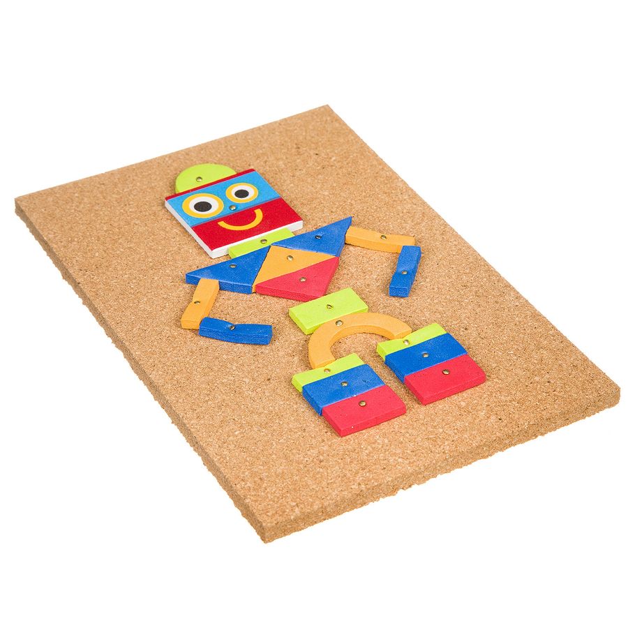 В состав входят пробковая основа, молоточек, гвоздики, яркие детали из EVA разной формы и инструкция с картинками-примерами.