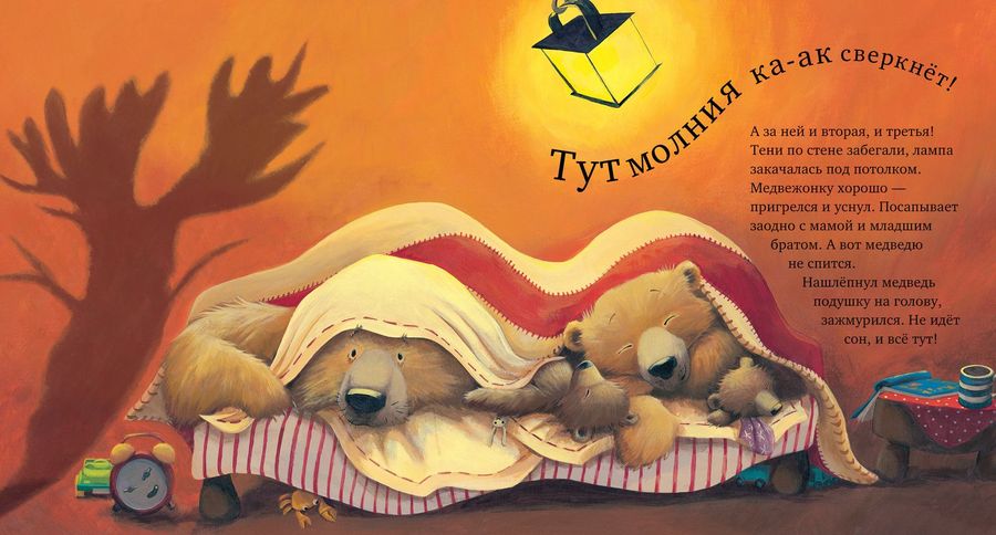 Вот только и папе теперь не спится! Шумит лес, ветви деревьев стучат в окно, гремит гром. И что это за жуткая тень на стене? Быть может медвежата правы, и за дверью кто-то есть?