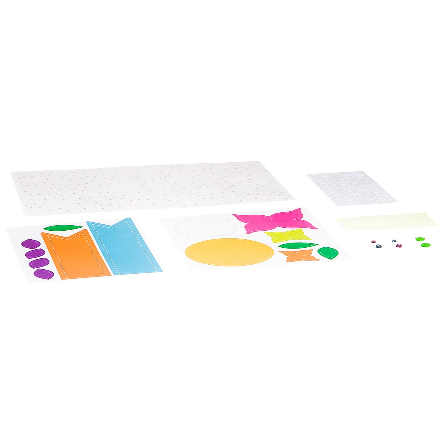 В наборе основа для открытки, материалы для аппликации и украшения бумажные, тканевые, пластиковые элементы, двусторонний скотч.