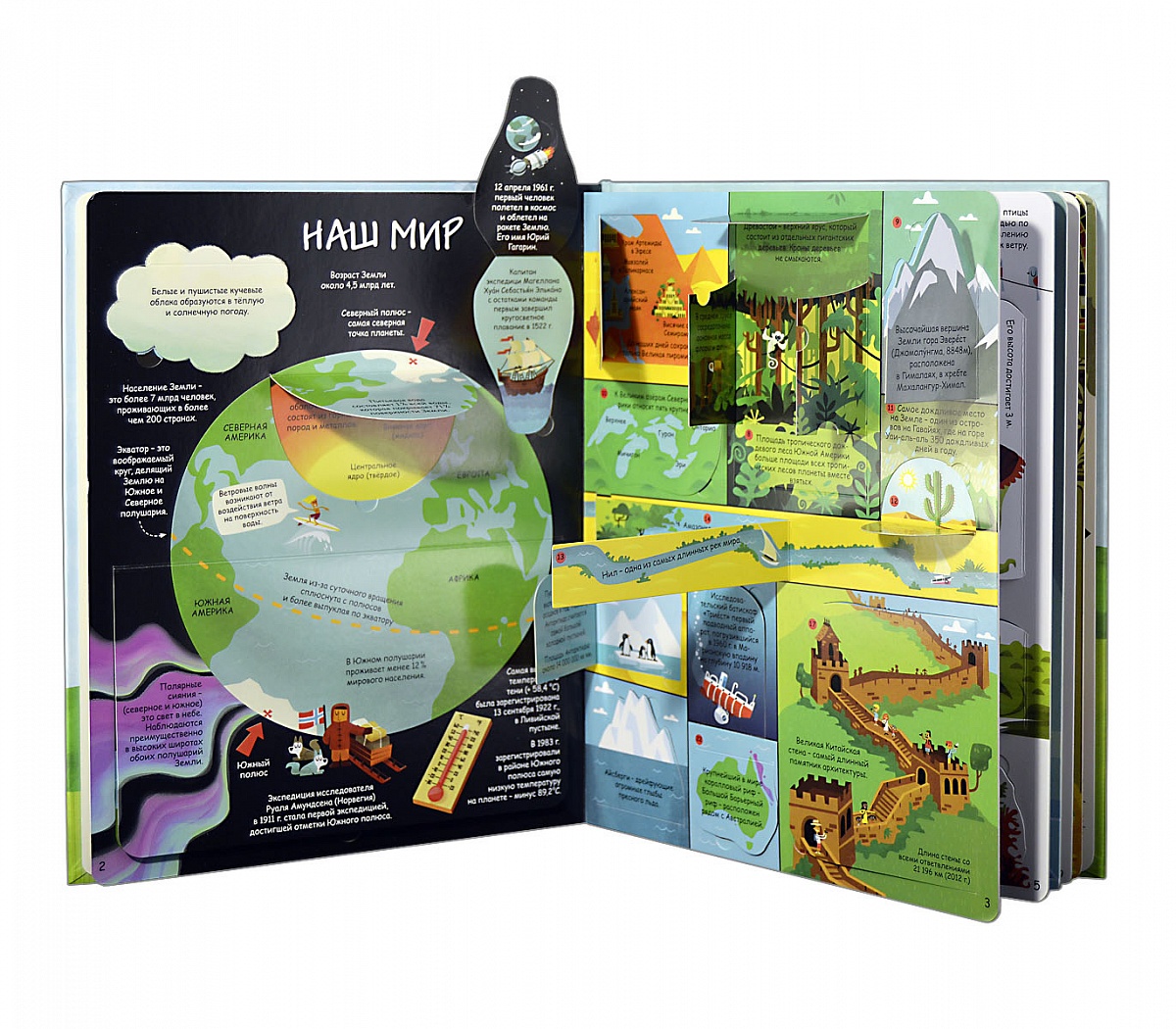 - Яркие и детальные иллюстрации, а также 135 створок, за которыми прячутся факты, касающиеся достижений человечества.