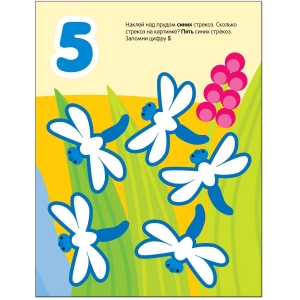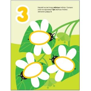 С помощью этой книги малыш познакомится со счетом (на листочки нужно наклеить двух божьих коровок, трёх пчёлок, 5 стрекоз, рядом с котёнком цифру «1», с четырьмя улитками цифру «4» и т. д.).