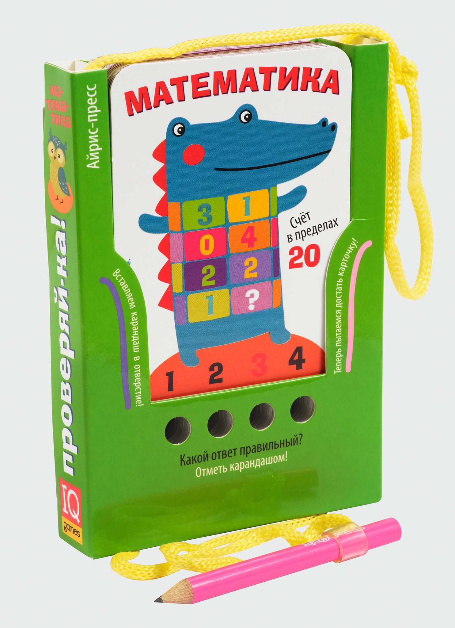 Первая игра с карточками построена по типу теста. Нужно найти, какого числа не хватает, найти значение выражения, найти ошибку в примере или посчитать количество элементов на карточке и т. п., затем выбрать подходящий вариант ответа и вставить карандаш в отверстие под ним. Если ответ правильный, то карточка легко вынимается из блока. Если ребёнок выбрал неверный вариант ответа, он не сможет вытянуть карточку и перейти к следующему заданию.
