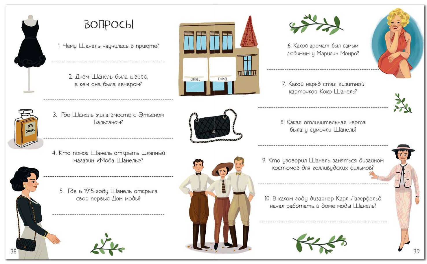 В конце книги ребенок найдет временную шкалу, которая поможет лучше запомнить основные моменты биографии Коко Шанель, а также 10 вопросов на запоминание прочитанного и ответы к ним.